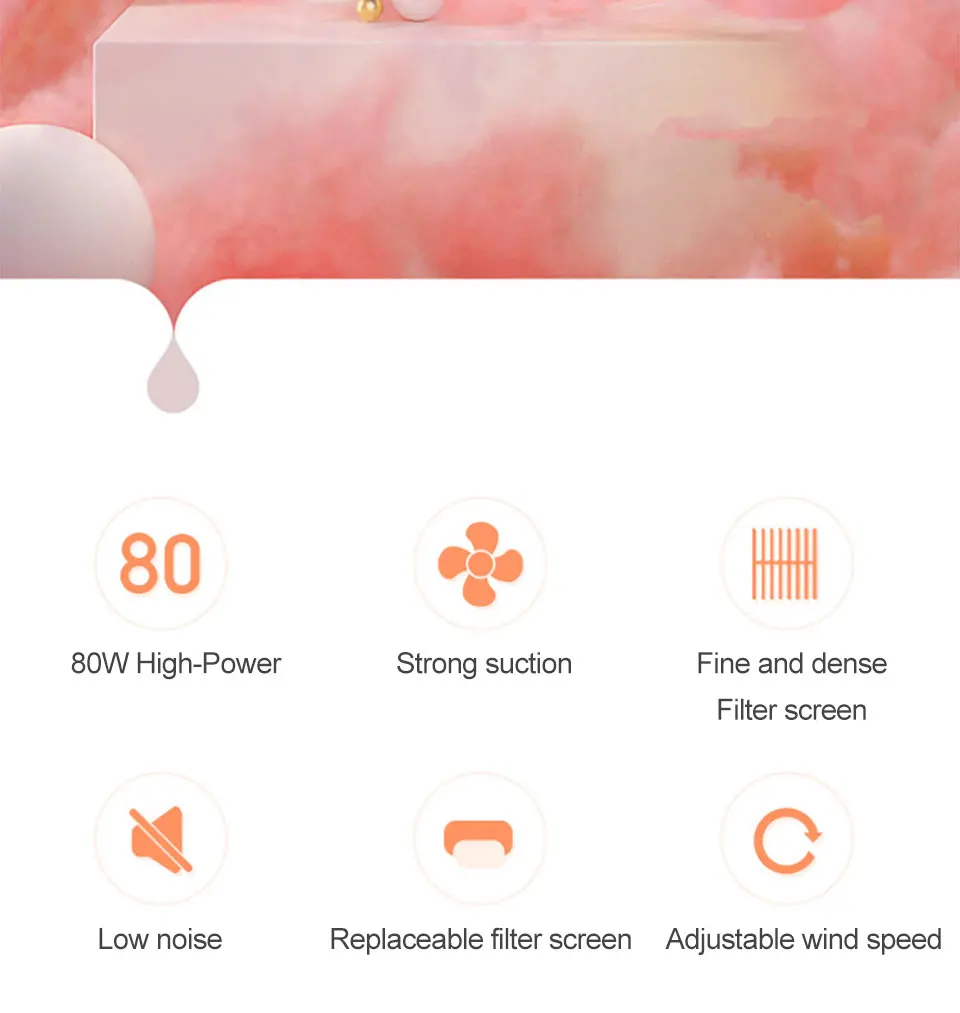 1. Strong suction to effectively clean 80W high power wind, high suction, strong nail dust and nail dust, deep suction, strong cleaning, long-term work without heat