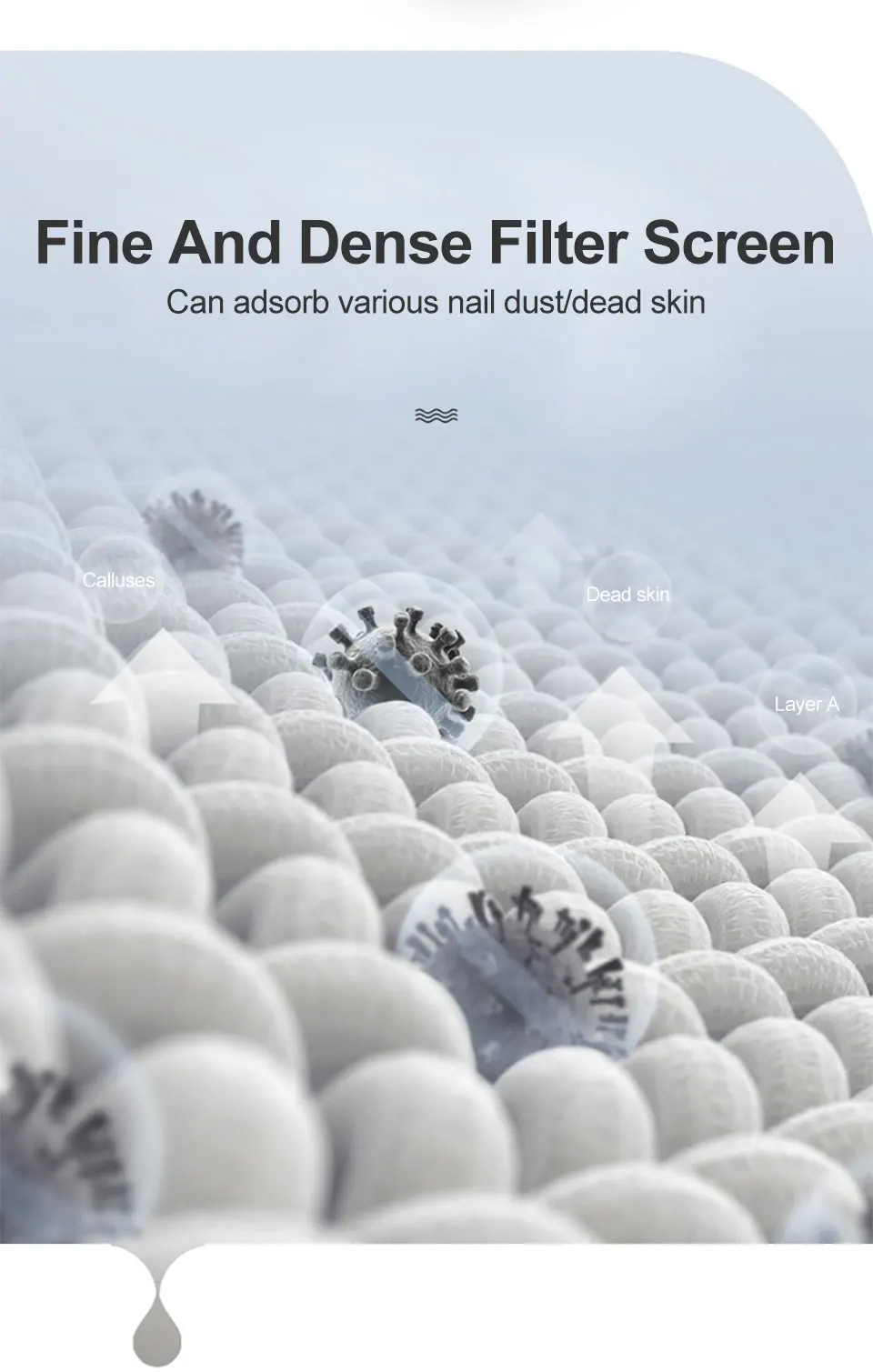 6. The fine filter screen can absorb all kinds of nail dust/nail dust/dead skin/calluses and other impurities, and can be washed clean and hygienic. Calluses, dead skin, nail dust